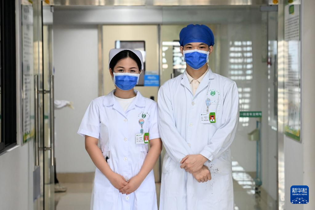 5月11日,在广西南宁市第四人民医院,杨江华(右)和吴雅静在一起合影。