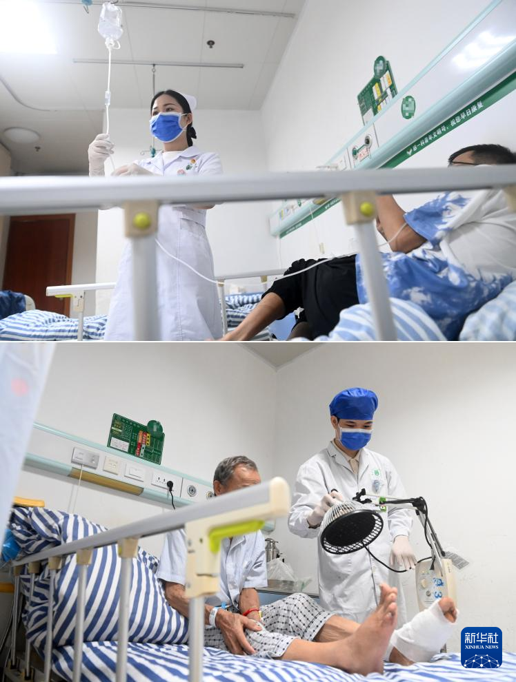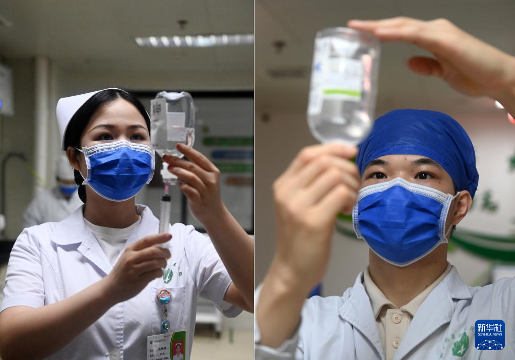 这是一张拼版照片。5月11日,在广西南宁市第四人民医院,吴雅静(上图)在给病人打点滴,杨江华(下图)在护理病人。