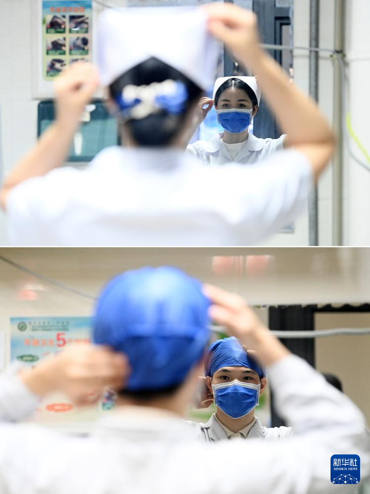 这是一张拼版照片。5月11日,在广西南宁市第四人民医院,吴雅静(上图)、杨江华(下图)在戴帽子准备工作。