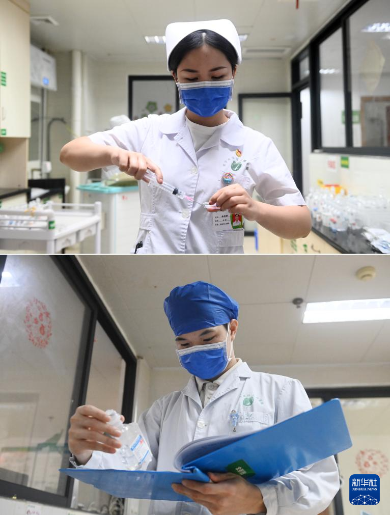 这是一张拼版照片。5月11日,在广西南宁市第四人民医院,吴雅静(左图)、杨江华(右图)在给病人配药。