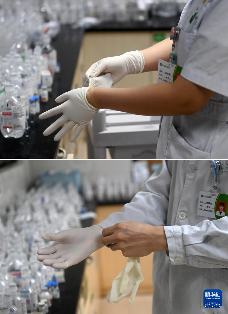 这是一张拼版照片。5月11日,在广西南宁市第四人民医院,吴雅静(上图)、杨江华(下图)在戴手套准备工作。