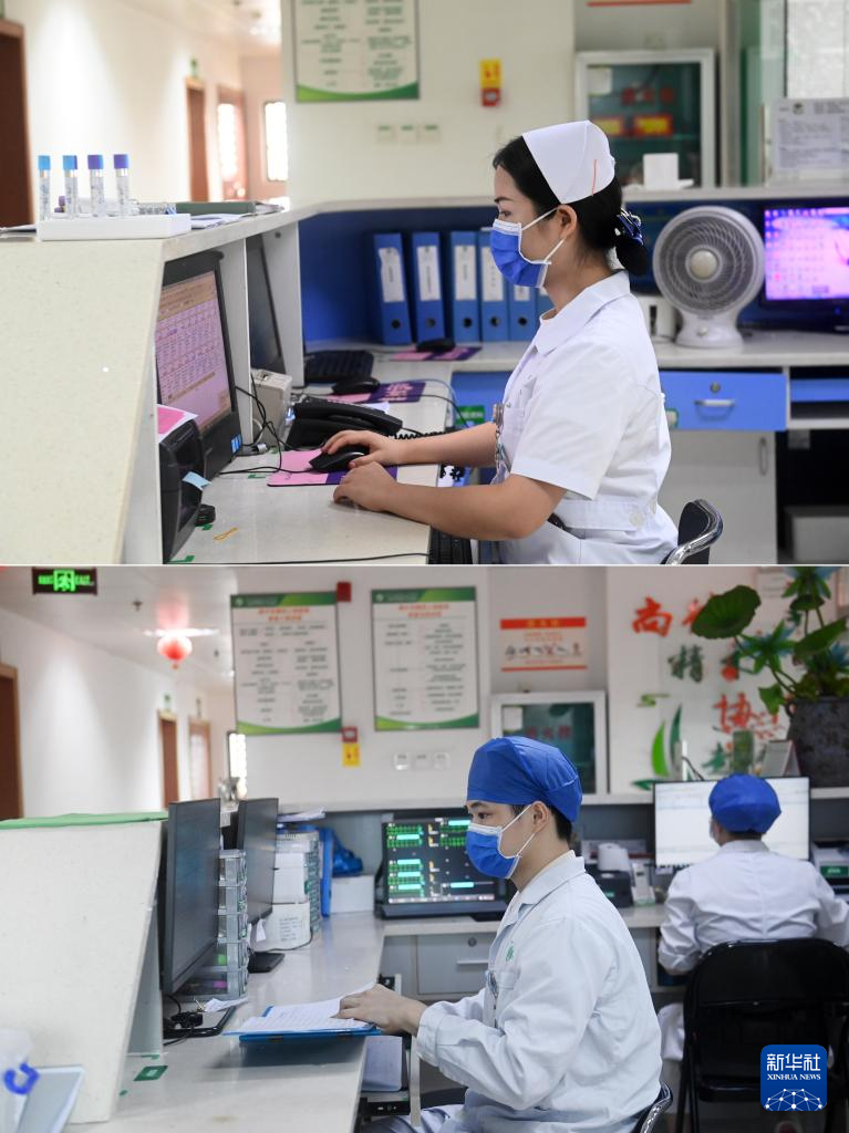这是一张拼版照片。5月11日,在广西南宁市第四人民医院,吴雅静(上图右一)、杨江华(下图右一)在核对病人信息。