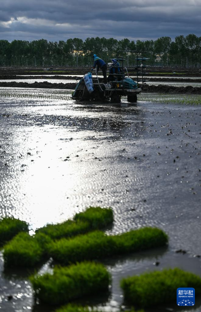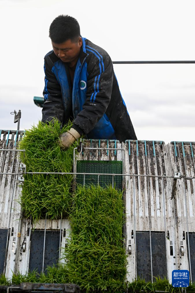 5月11日,农民在内蒙古兴安盟扎赉特旗好力保镇的水稻田内给播种机装填秧苗。