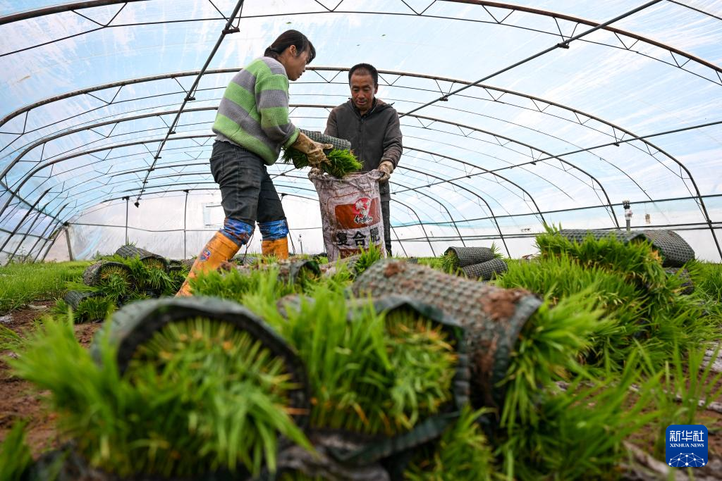 5月11日,农民在内蒙古兴安盟扎赉特旗好力保镇一处育秧棚内装秧苗。