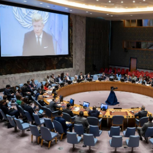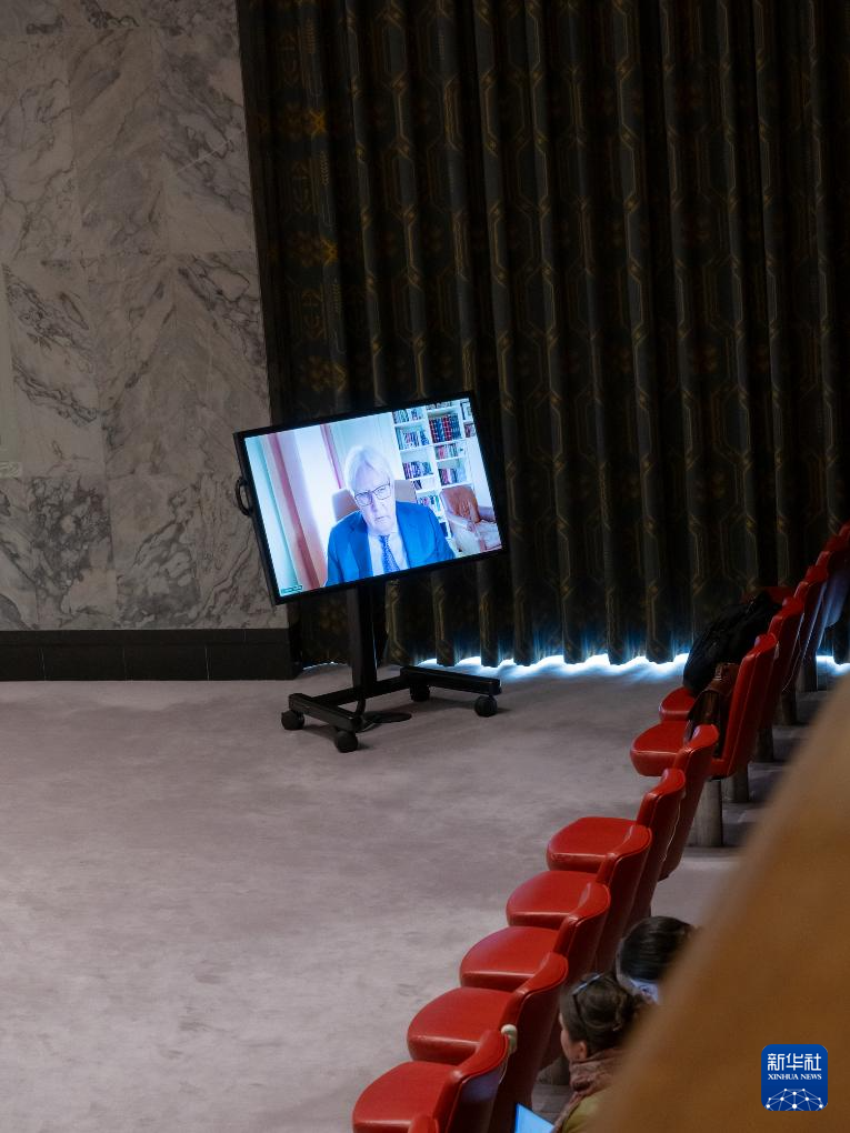 5月13日,在位于纽约的联合国总部,联合国副秘书长兼紧急救援协调员马丁·格里菲思在安理会也门问题公开会上通过视频发言。