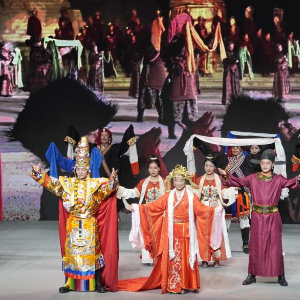 来自青海玉树藏族自治州岭格珠民间歌舞团的农牧民演员在表演民族团结进步短剧《唐蕃古道》(5月13日摄)。