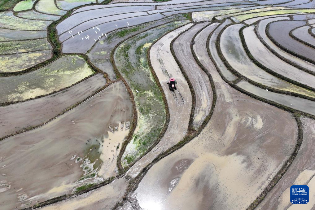 5月14日,在贵州省黔东南苗族侗族自治州岑巩县水尾镇新场村,农机手驾驶农机犁田(无人机照片)。
