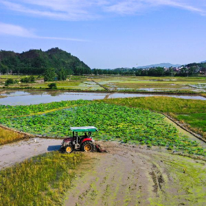 5月14日,湖南省郴州市桂阳县流峰镇农民驾驶农机在翻耕农田(无人机照片)。