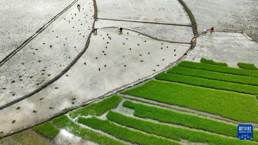 5月14日,村民在贵州省开阳县马头村移栽秧苗(无人机照片)。