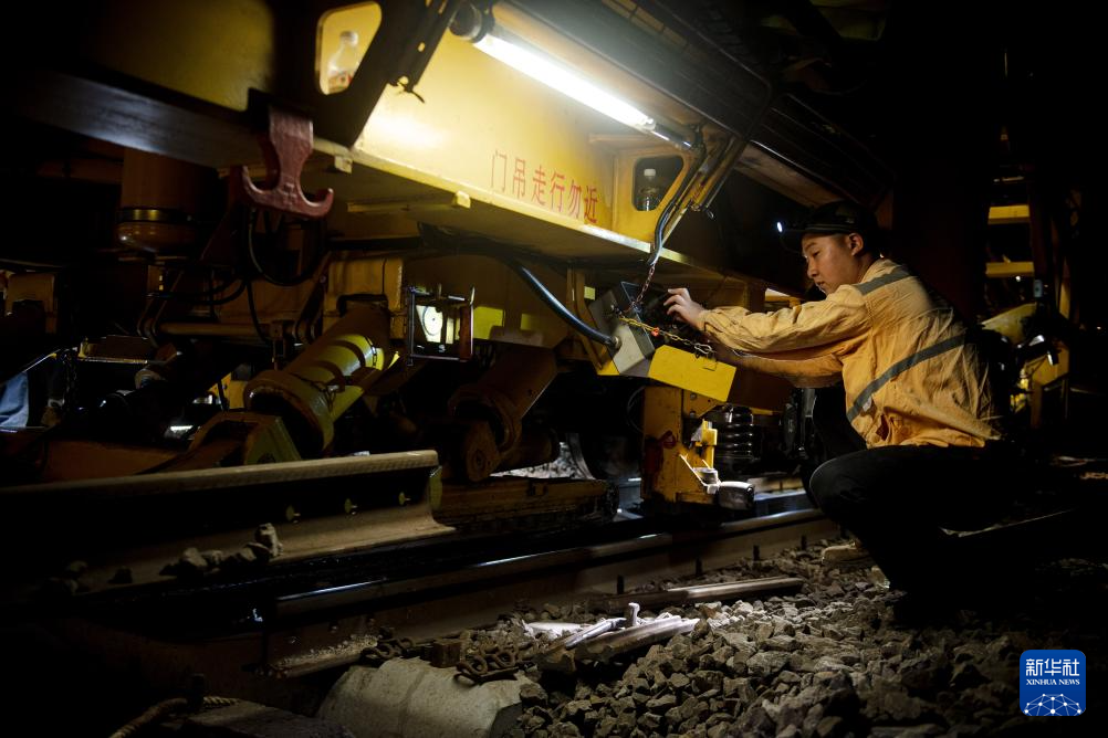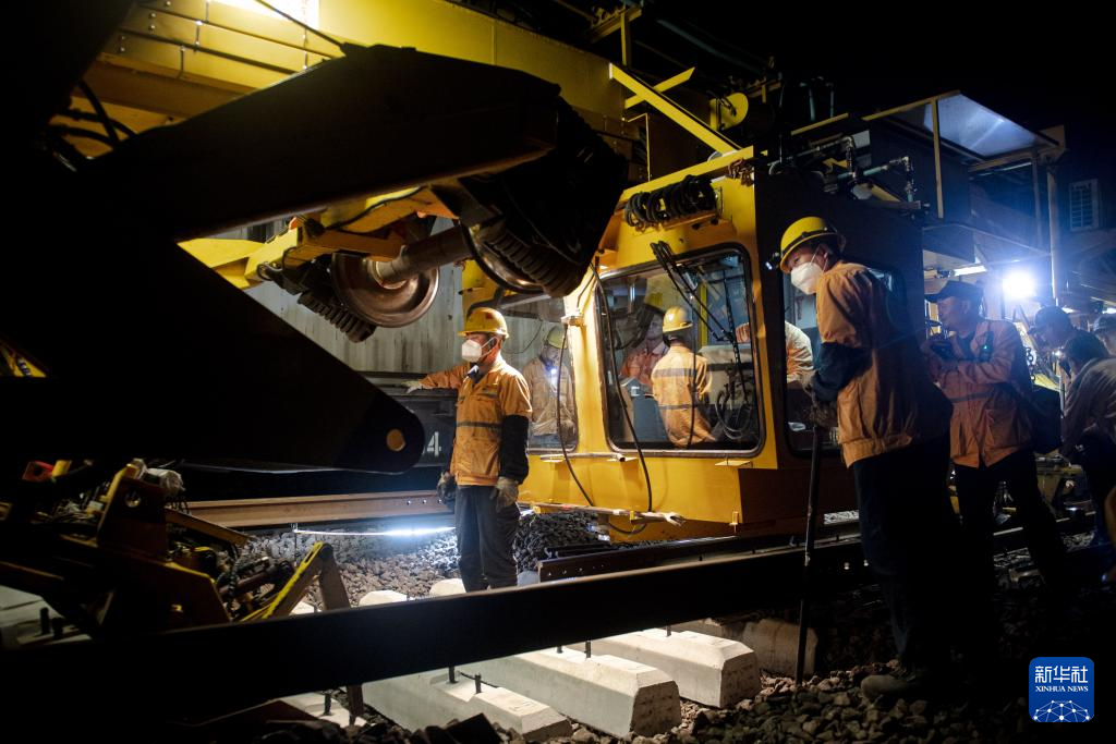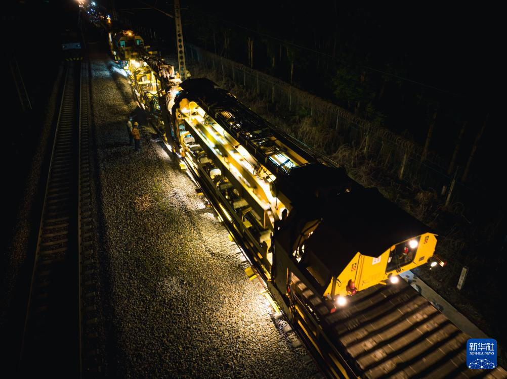 5月14日深夜,铁路工人操纵大修列车对沪昆铁路沪杭段进行机械化大修换枕施工作业。