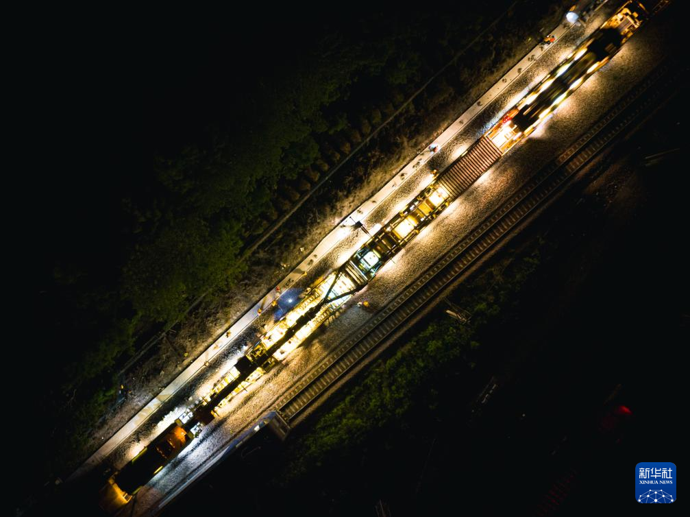 5月15日凌晨,大修列车在沪昆铁路沪杭段上进行机械化大修换枕施工作业(无人机照片)。