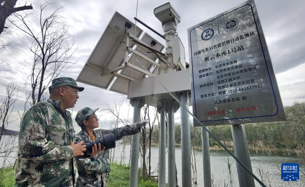 密云水库水生态所的技术人员利用部署在鸟岛附近的河湖鸟类AI智能识别自动监测站观测鸟类繁育情况(5月14日摄)。