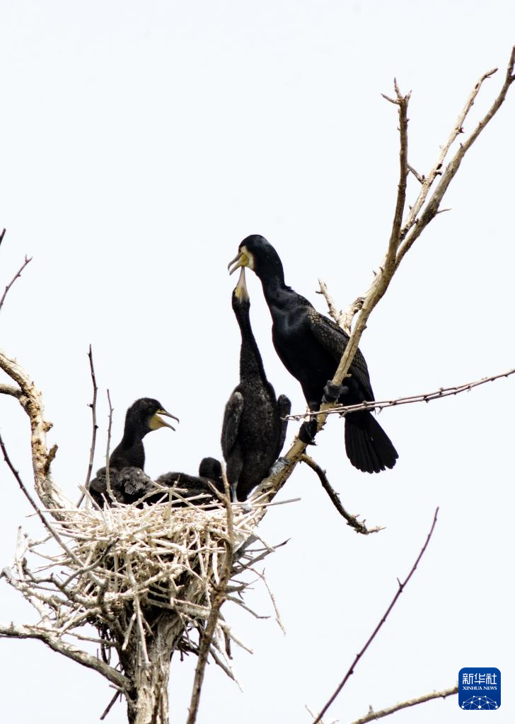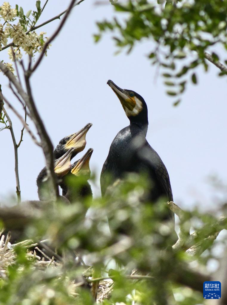 密云水库鸟岛上的鸬鹚在喂养小鸟(5月14日摄)。
