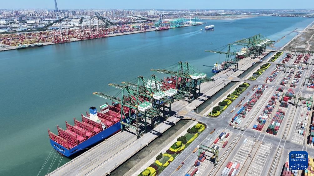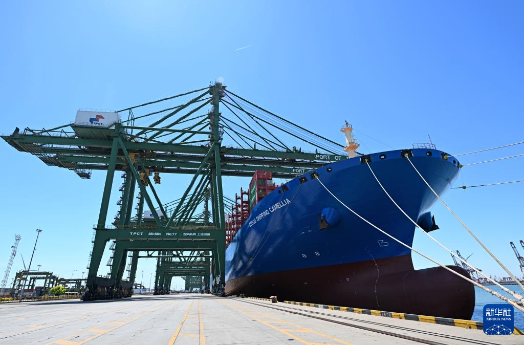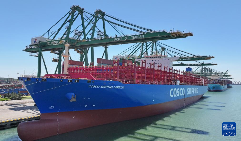 5月15日,“中远海运山茶”轮靠泊在天津港太平洋国际集装箱码头装载货物(无人机照片)。