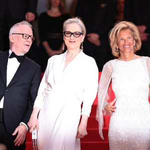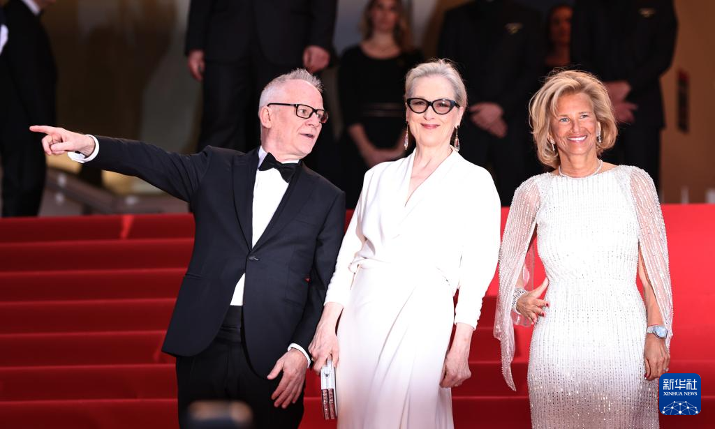 5月14日,在法国南部小城戛纳,美国演员梅丽尔·斯特里普(中)、戛纳电影节主席伊丽丝·克诺布洛赫(右)与戛纳电影节总代表蒂埃里·弗雷莫亮相第77届戛纳国际电影节开幕式红毯。