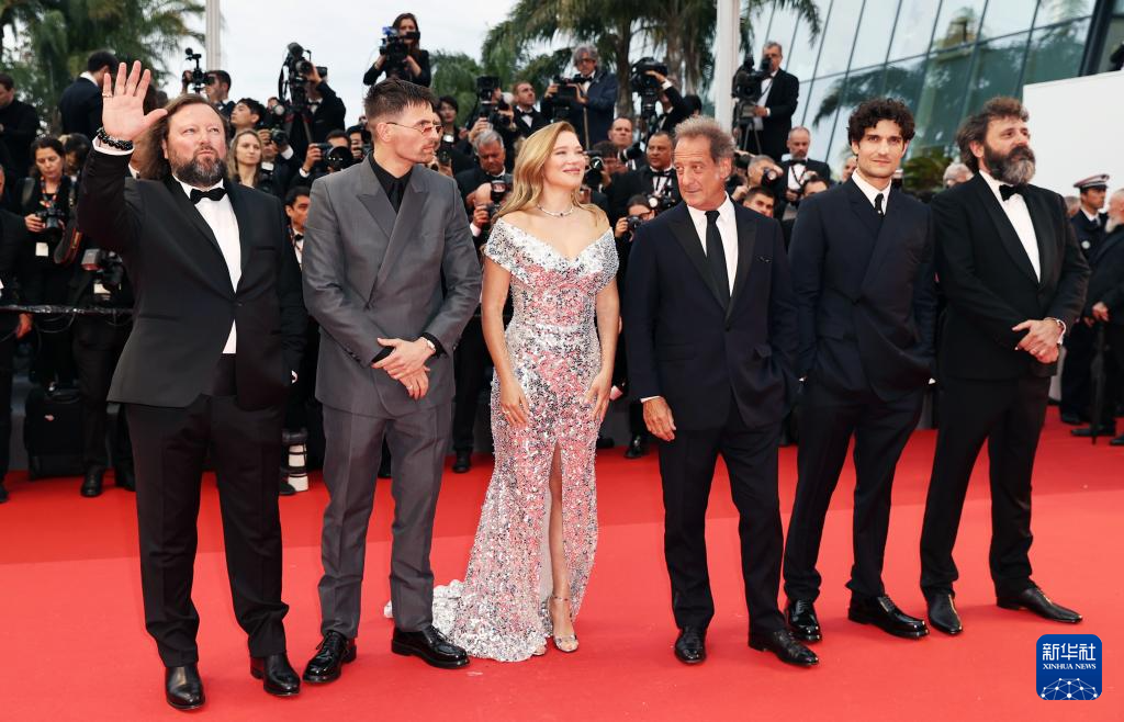 5月14日,在法国南部小城戛纳,开幕影片《第二幕》的主创人员亮相第77届戛纳国际电影节开幕式红毯。