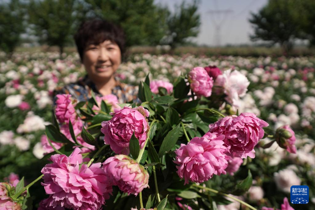 5月15日,花农在河北省柏乡县内步乡马村芍药种植基地内采收芍药。