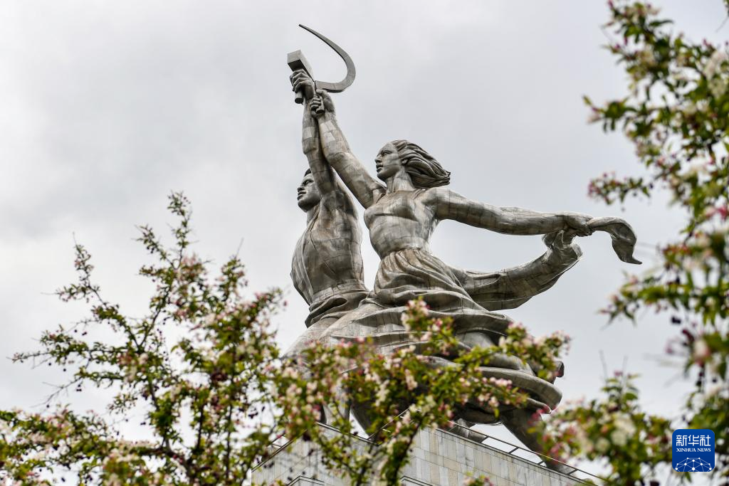这是5月13日在俄罗斯首都莫斯科拍摄的工人与集体农庄女庄员雕塑。