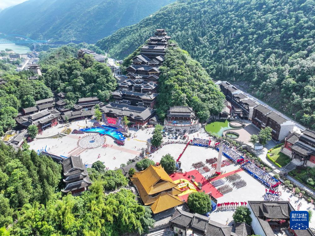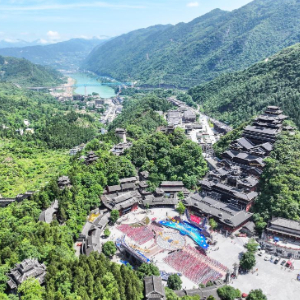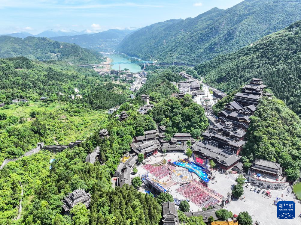 5月15日,苗族同胞在重庆市彭水苗族土家族自治县的蚩尤九黎城庆祝传统节日(无人机照片)。