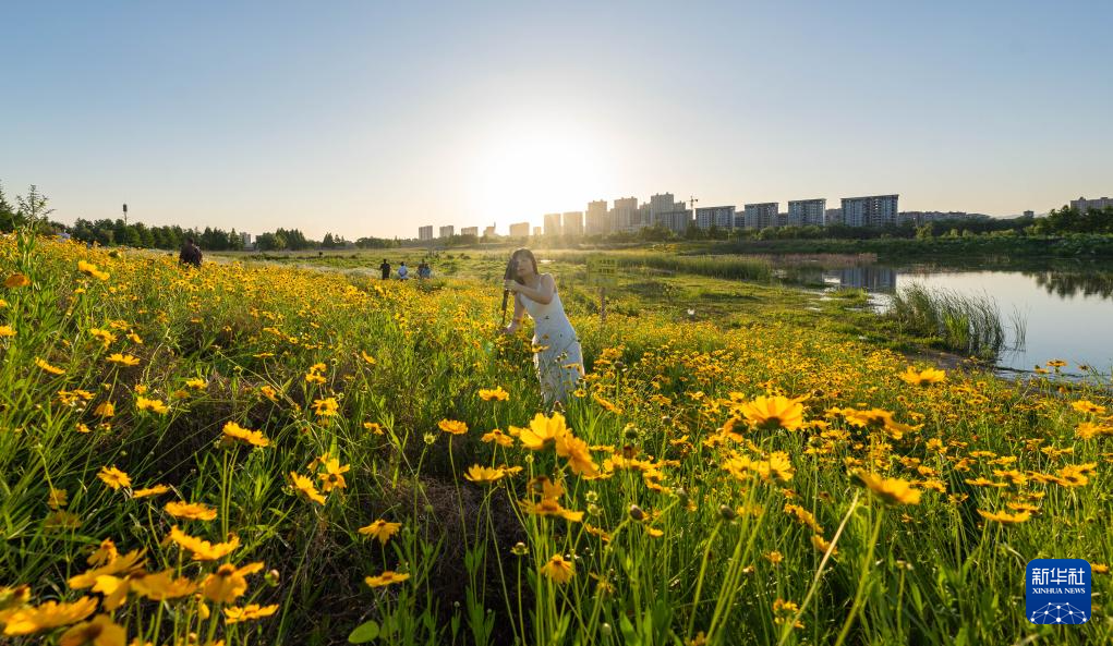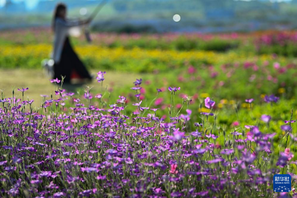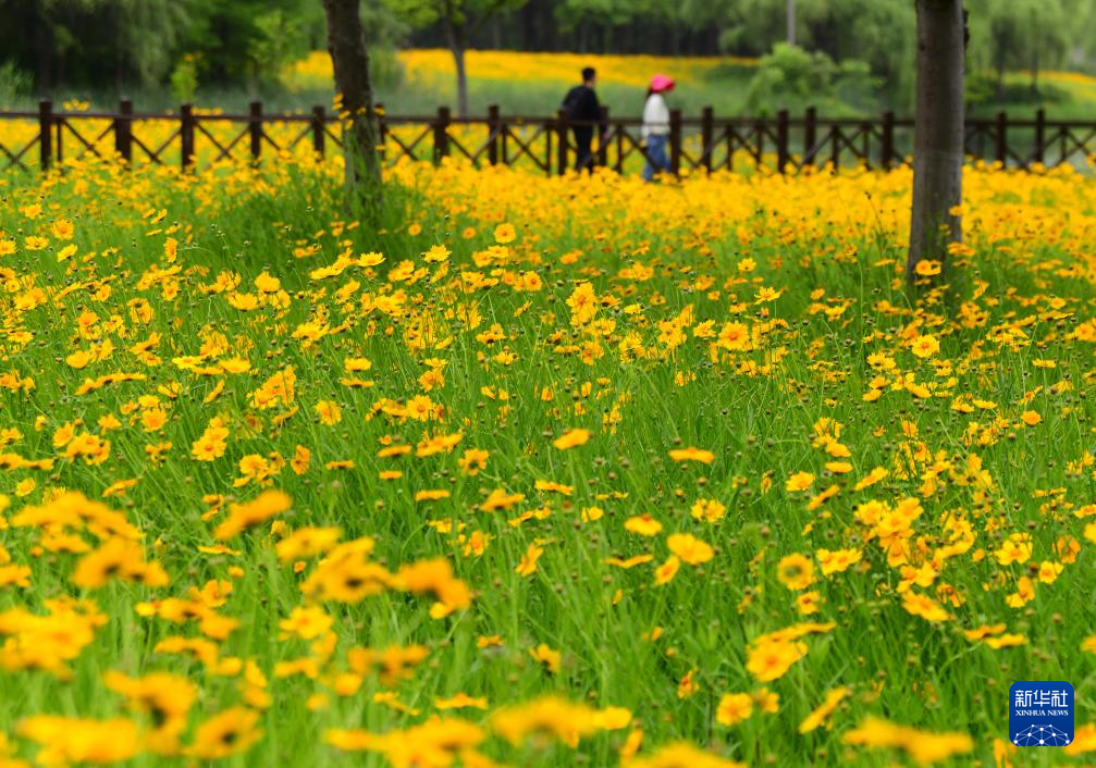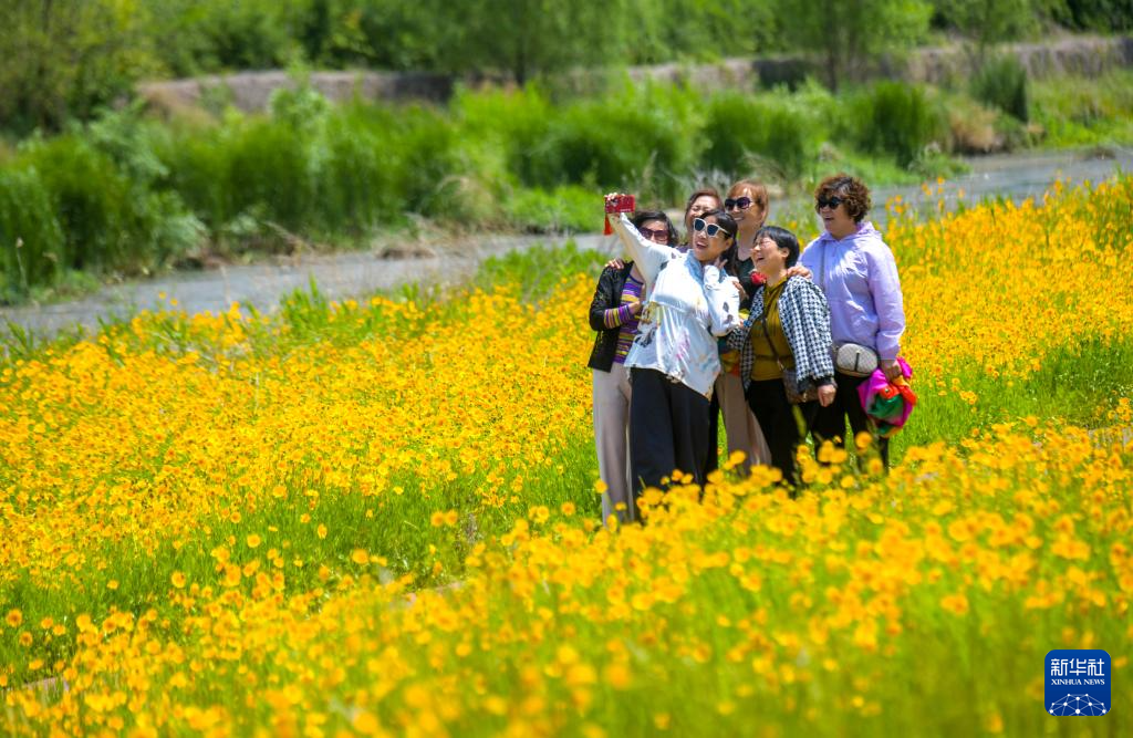 5月15日,在河南省洛阳市新安县涧河边,人们在河畔花海中拍照。