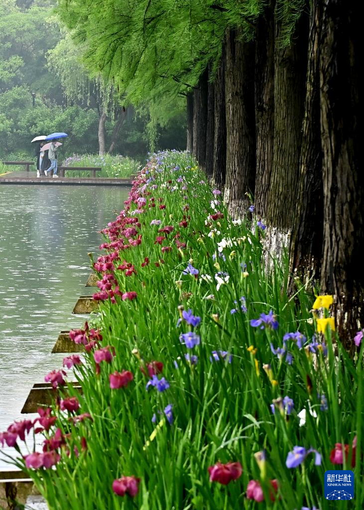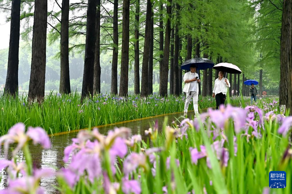 5月11日,市民在江苏省常州市圩墩遗址公园观赏鸢尾花。
