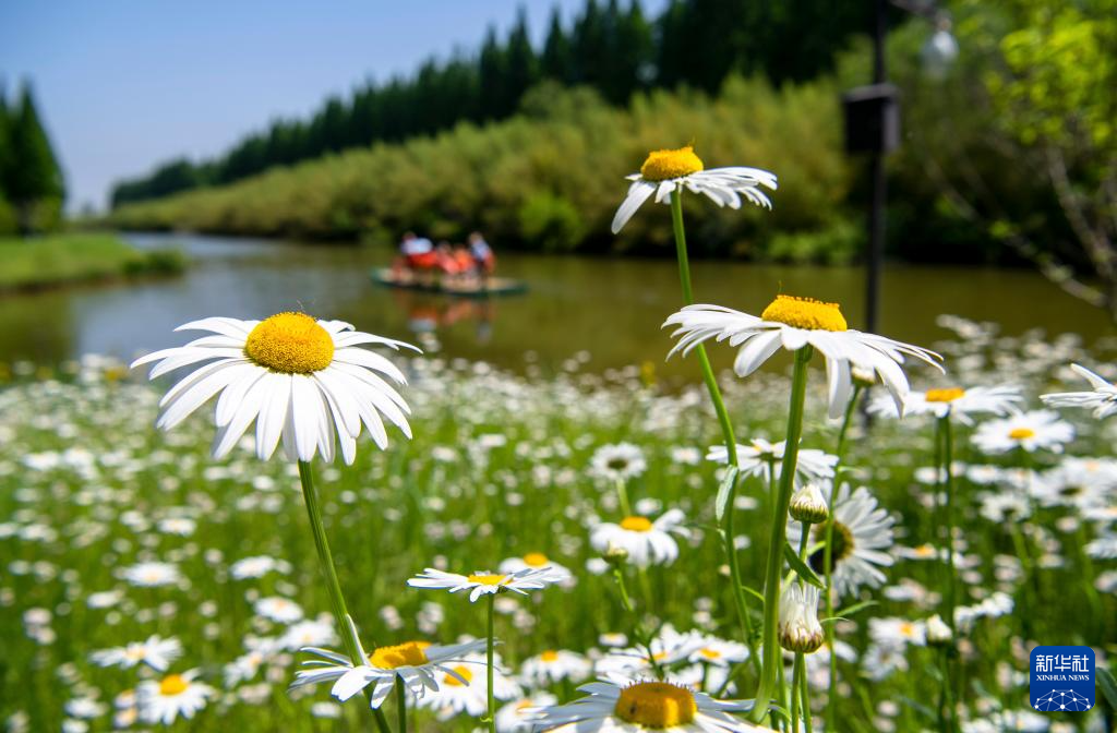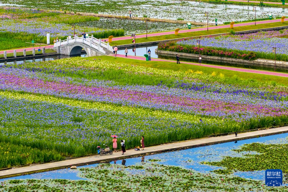 5月12日,游人在江苏无锡贡湖湾湿地公园赏花游玩。