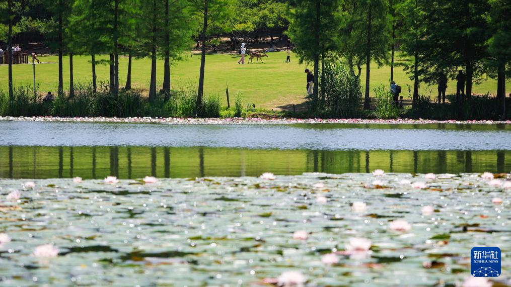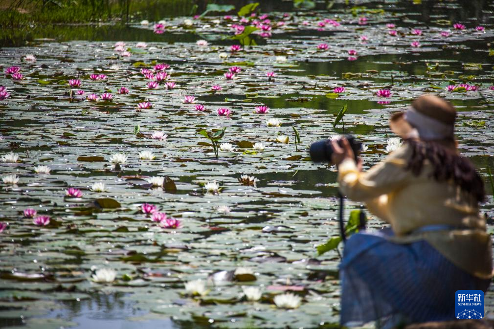 5月13日,游人在南京明孝陵景区燕雀湖畔拍摄睡莲。