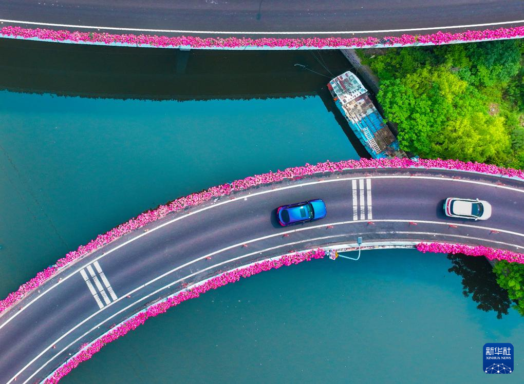 5月7日,汽车行驶在浙江省宁波市的高架路上,路边是盛开的月季花(无人机照片)。