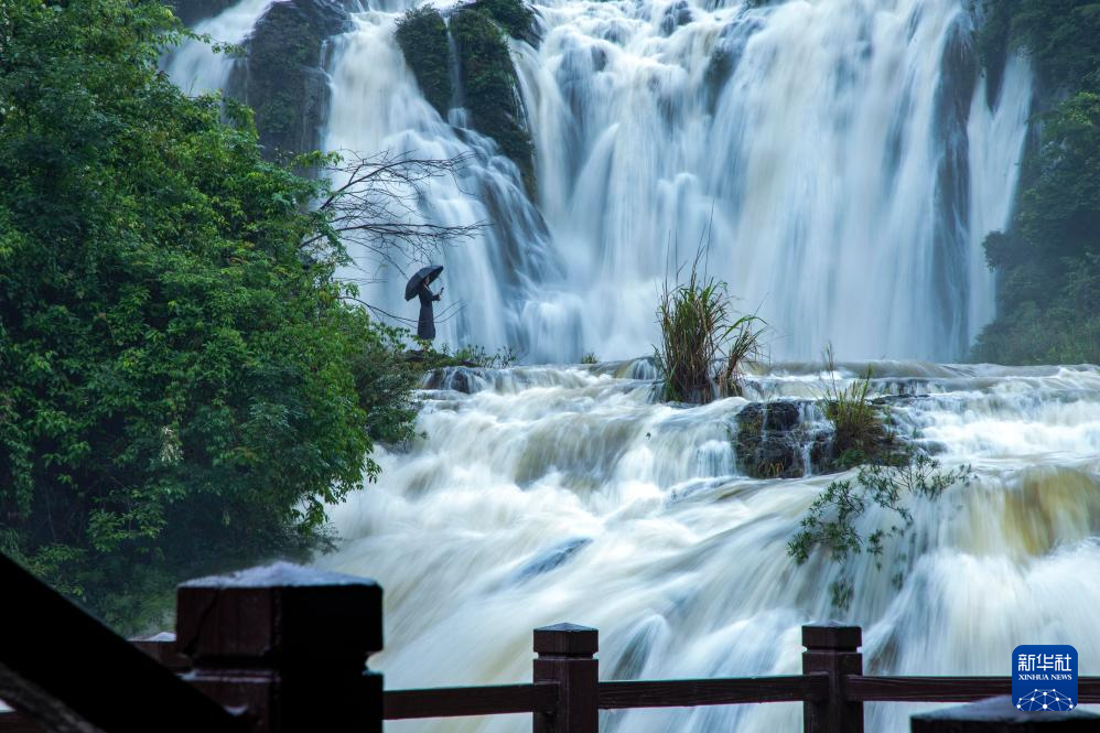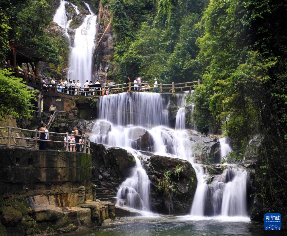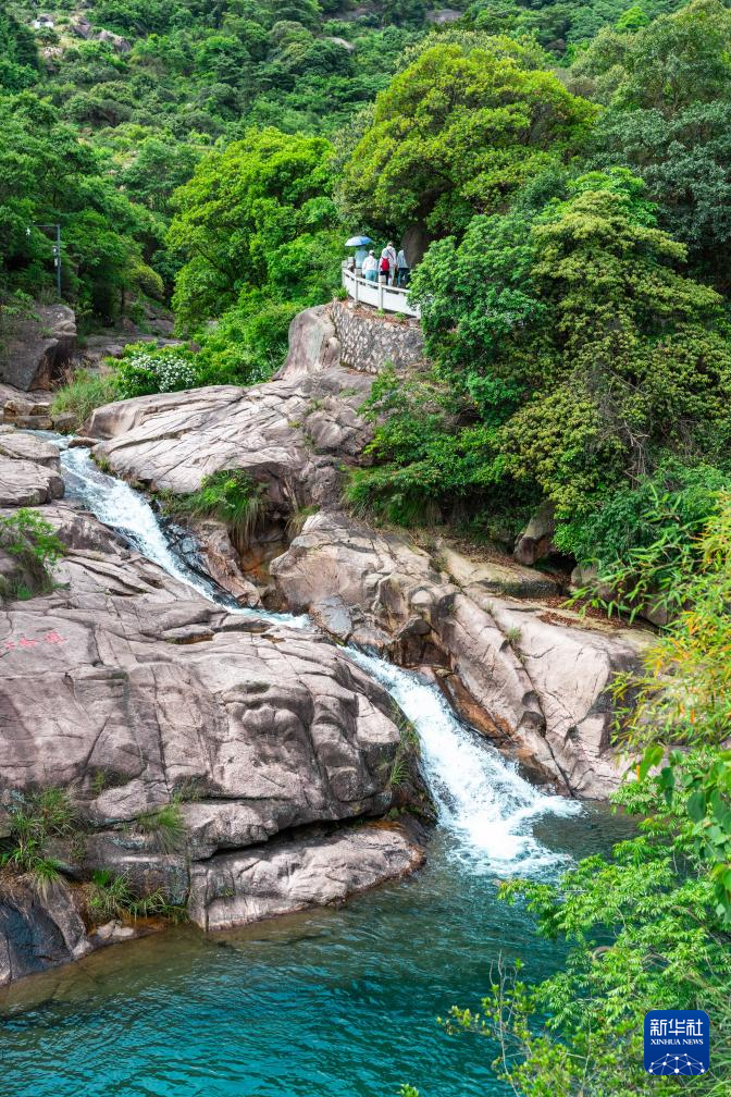 5月8日,在广东肇庆鼎湖山飞水潭,游客在观赏瀑布。