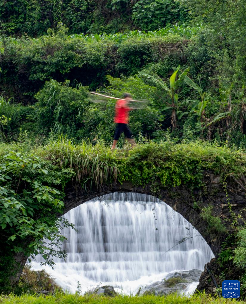 5月9日,一名村民走过贵州省丹寨县五一村的瀑布拱桥。