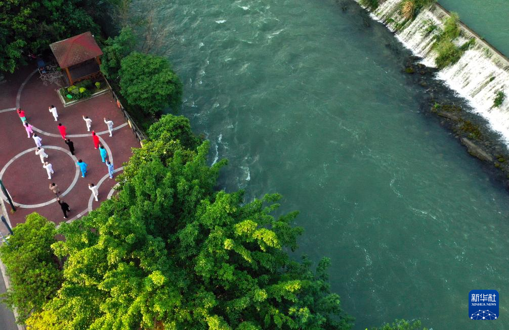 5月15日,四川省都江堰市居民在岷江河道边的公园里晨练(无人机照片)。