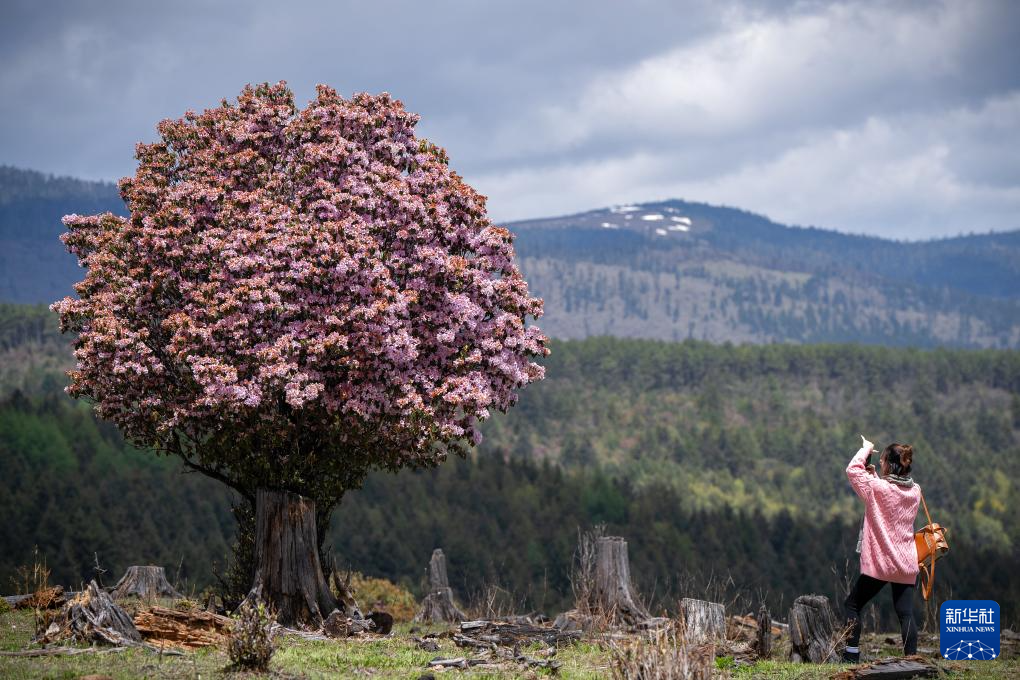 5月13日,在云南省迪庆藏族自治州香格里拉市虎跳峡镇,游客拍摄高山杜鹃。