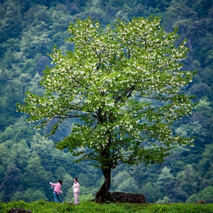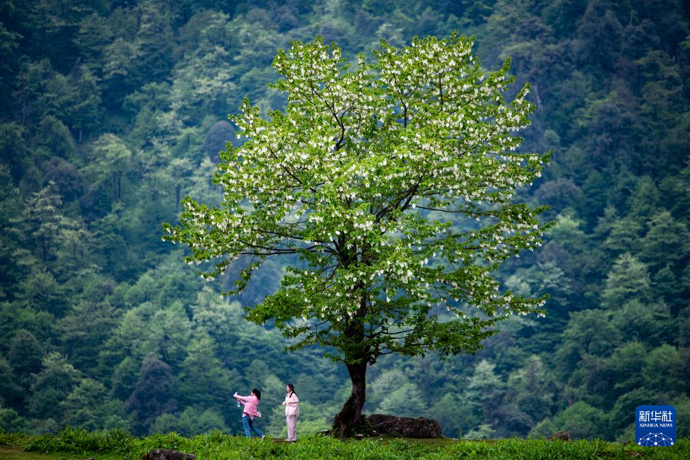 5月6日,游客在四川省乐山市峨边彝族自治县黑竹沟的珙桐树下拍照游玩。