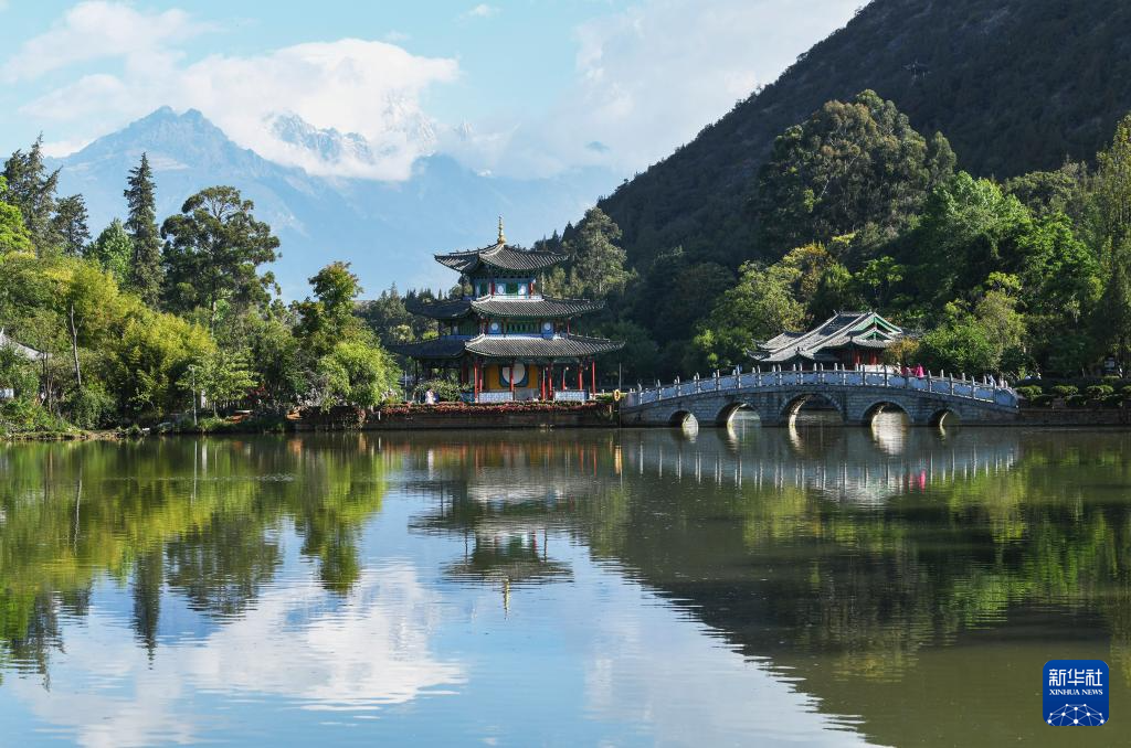 5月14日拍摄的云南丽江黑龙潭公园和玉龙雪山。