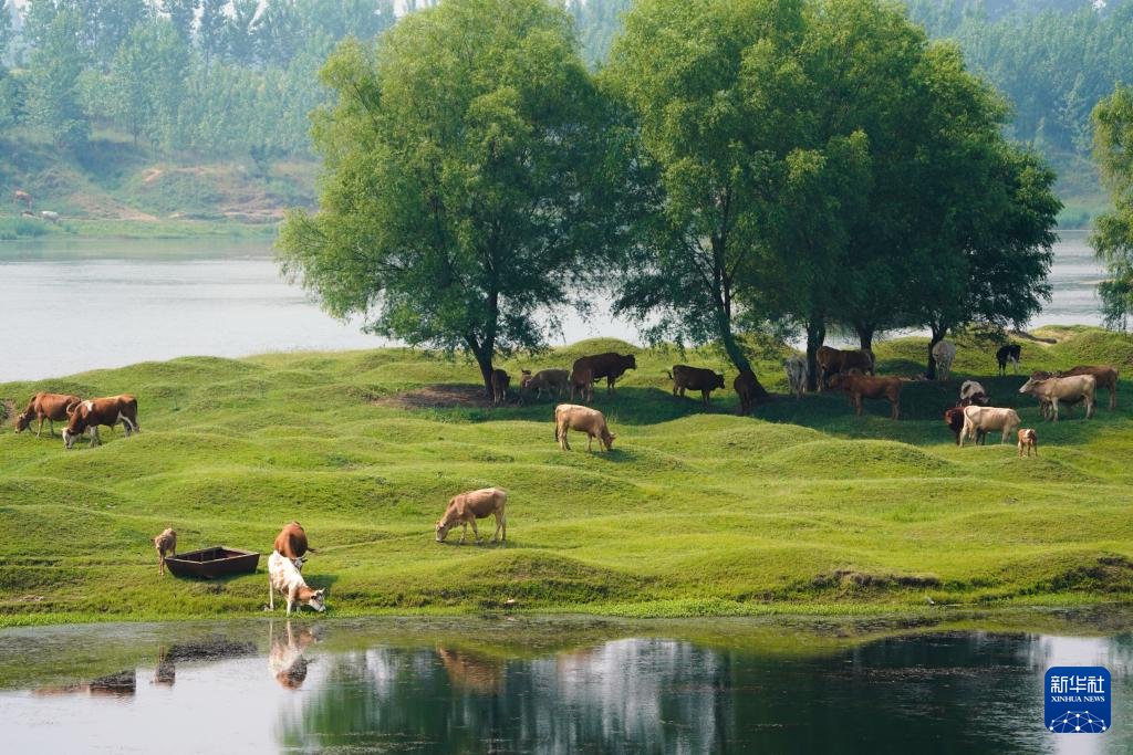 5月7日,在河南省驻马店市正阳县大林镇,牛群在淮河岸边吃草。