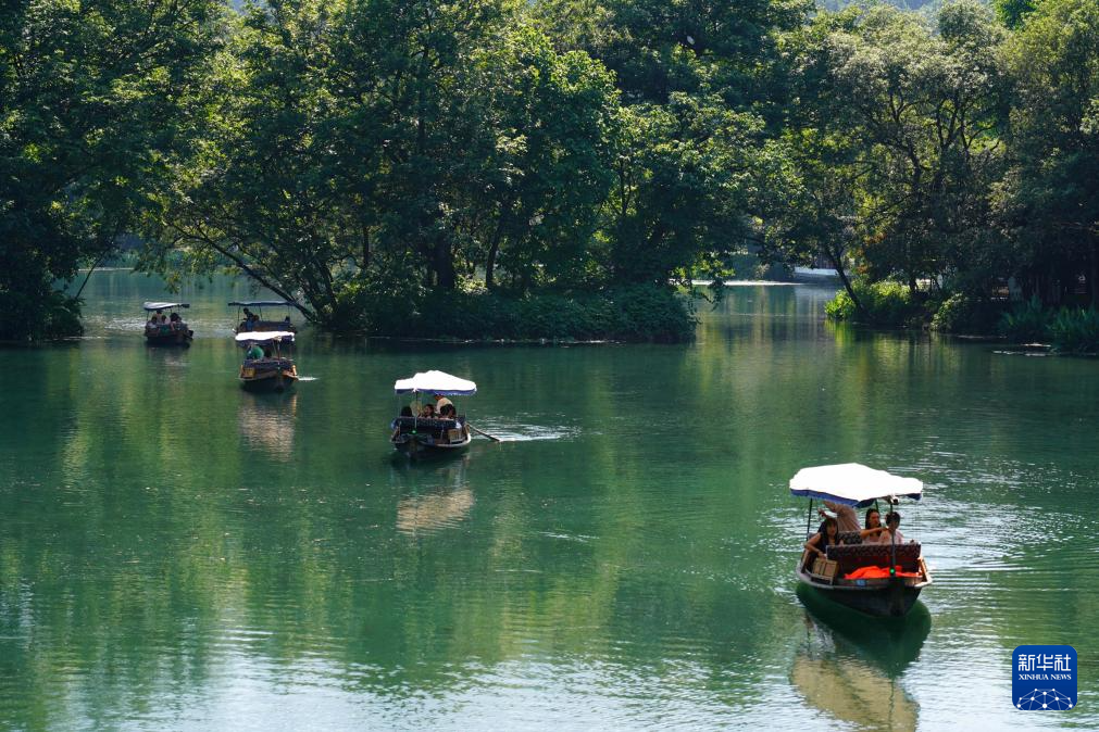 5月14日,游客在杭州浴鹄湾景区泛舟游玩。