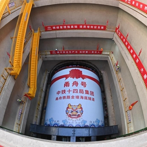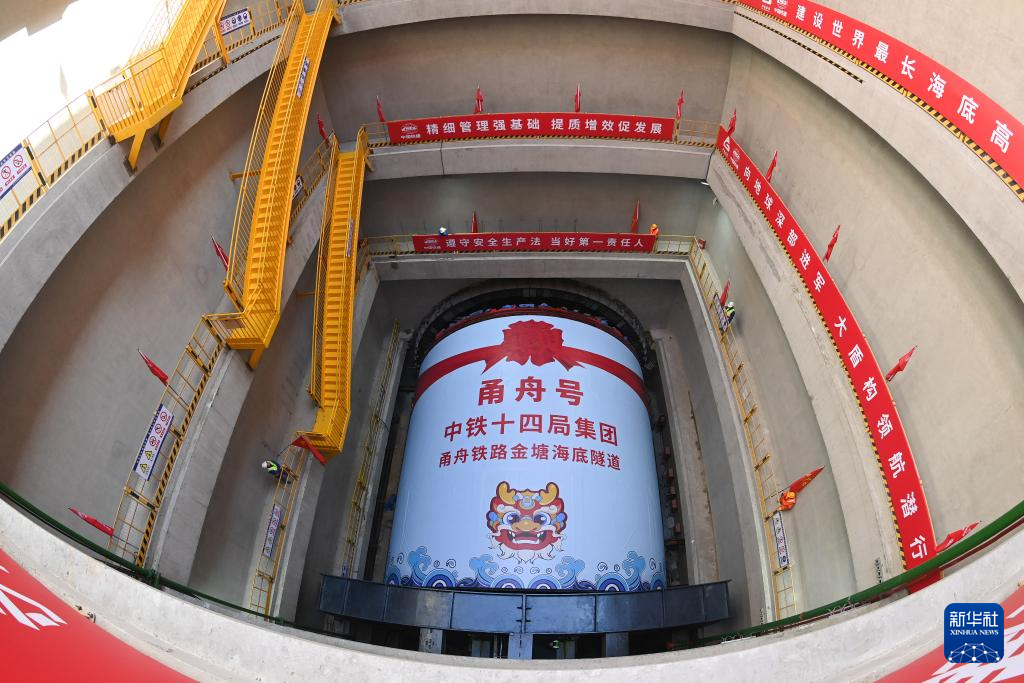 5月16日在甬舟铁路金塘海底隧道宁波侧盾构始发井拍摄的“甬舟号”盾构机。据介绍,隧道由中铁十四局和中铁十一局采用“甬舟号”和“定海号”两台盾构机相向掘进。