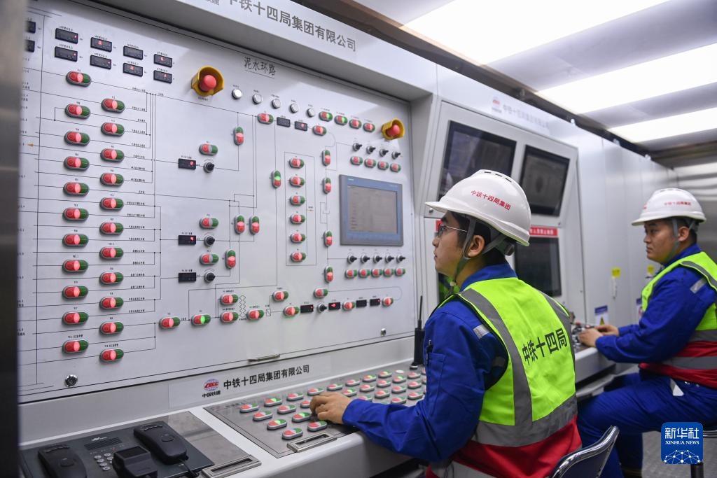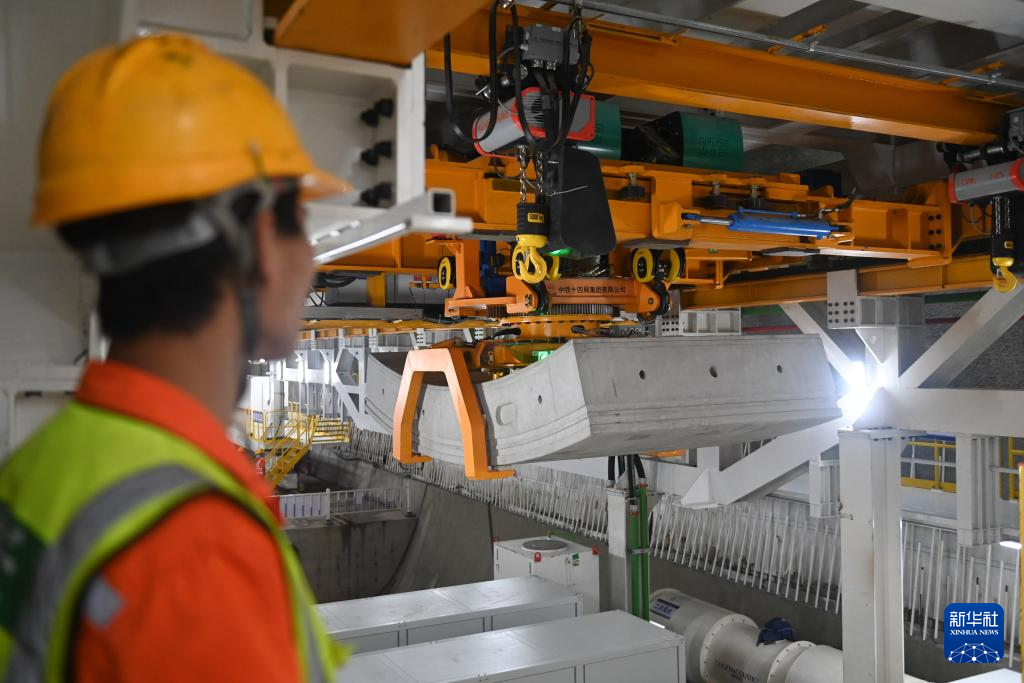 5月16日,中铁十四局技术人员在甬舟铁路金塘海底隧道内操作管片吊装设备。