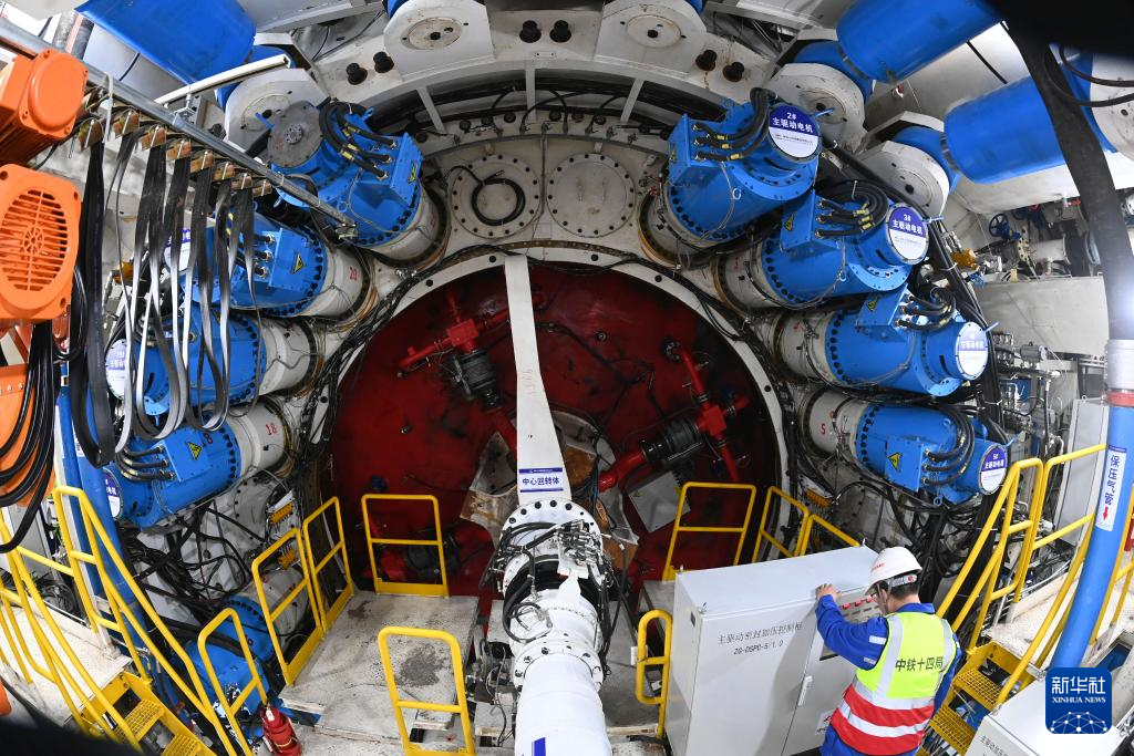 5月16日,中铁十四局技术人员在甬舟铁路金塘海底隧道“甬舟号”盾构机内作业。