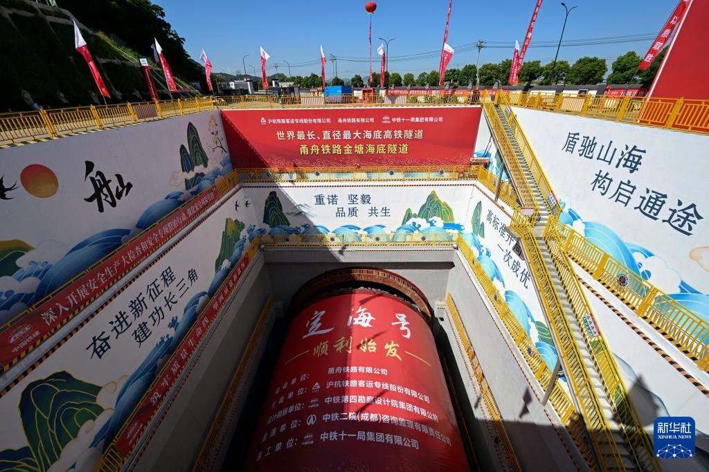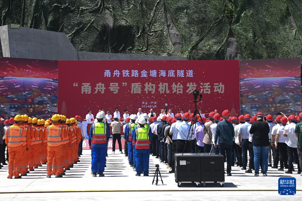 5月16日在甬舟铁路金塘海底隧道宁波侧拍摄的“甬舟号”盾构机始发活动现场。