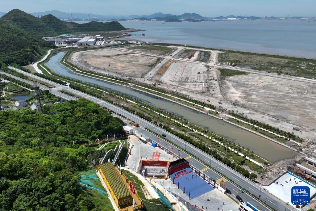 5月16日拍摄的甬舟铁路金塘海底隧道舟山侧盾构始发井,井下装有“定海号”盾构机(无人机照片)。据介绍,隧道由中铁十四局和中铁十一局采用“甬舟号”和“定海号”两台盾构机相向掘进。