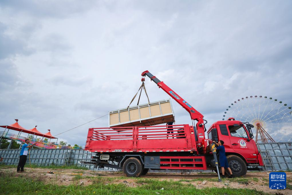 5月15日,给短肢领航鲸“海棠”定制的运输箱被吊送至三亚海昌生物保育中心的救助池附近。
