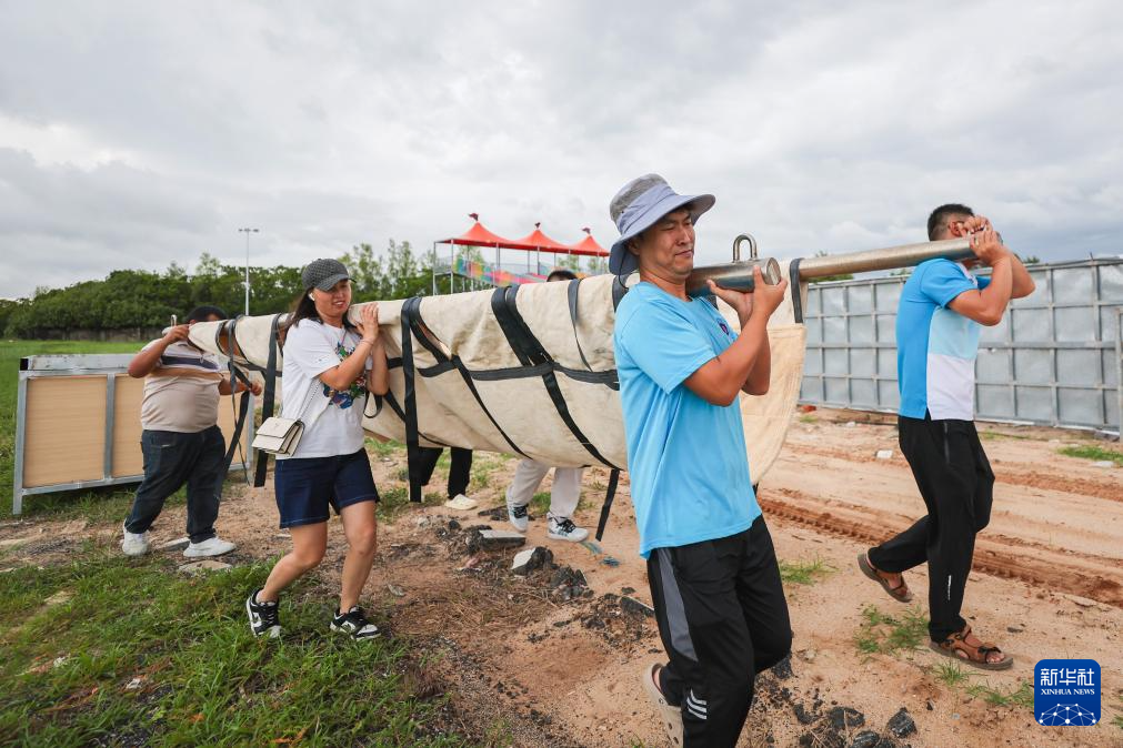 5月15日,蓝丝带海洋保护协会和三亚海昌生物保育中心的工作人员搬运运输动物使用的担架。