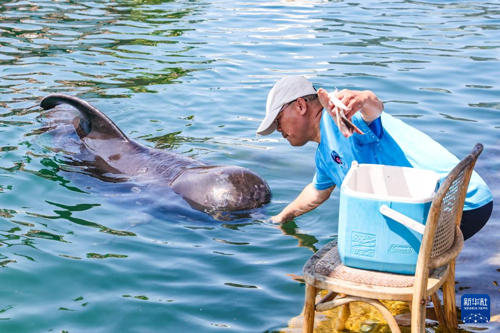 5月15日,海南三亚海昌生物保育中心的工作人员给短肢领航鲸“海棠”喂食(无人机照片)。