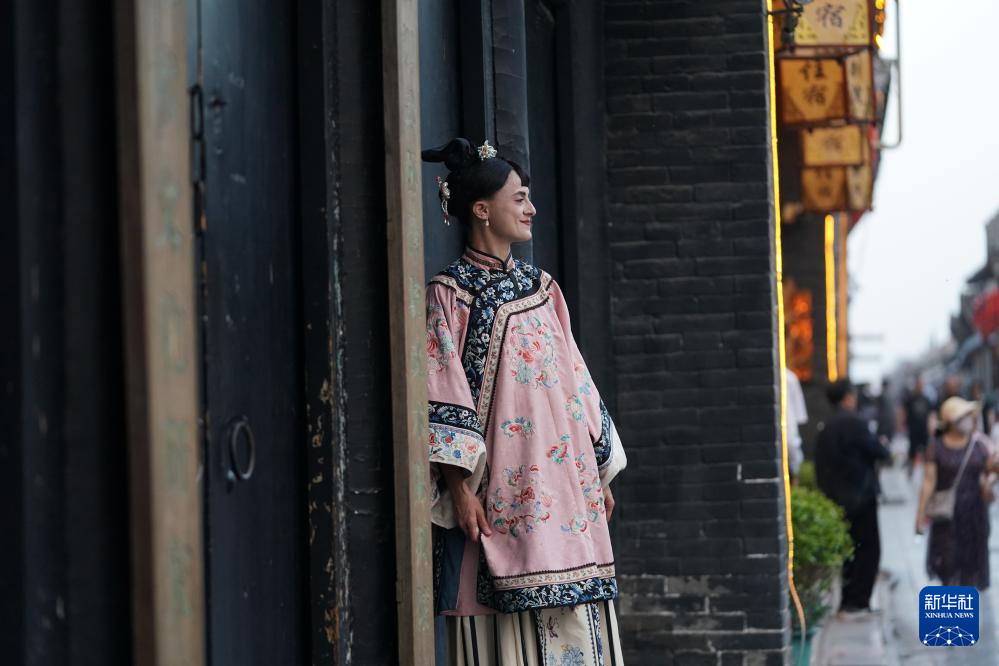 身着传统服装的游客在平遥古城拍照留影(5月14日摄)。