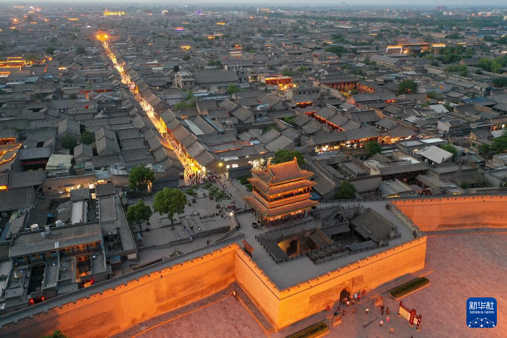 夜幕下的平遥古城迎薰门城楼(5月9日摄,无人机照片)。