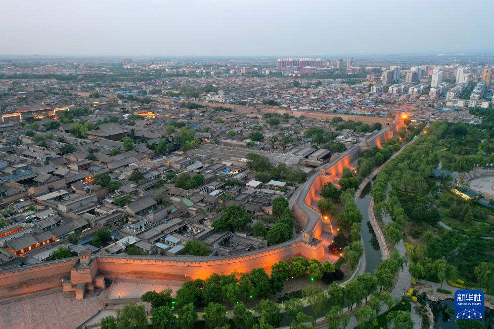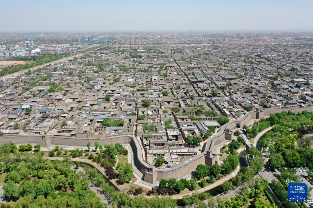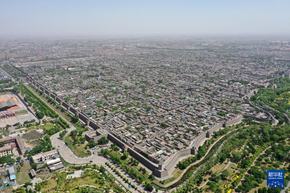 平遥古城城墙及护城河(5月9日摄,无人机照片)。