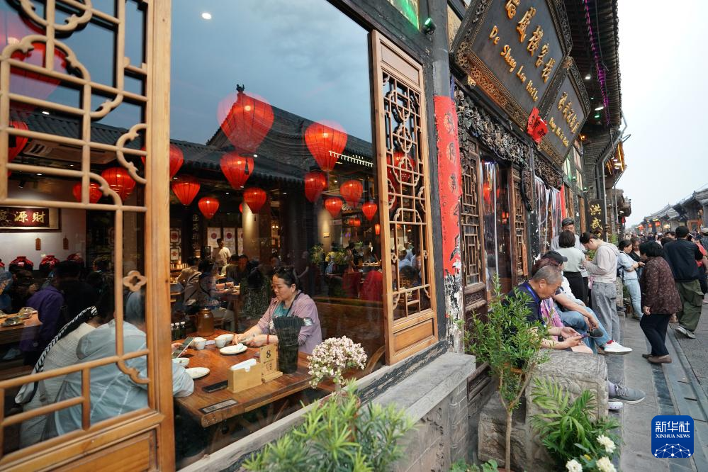 游客在平遥古城南大街一家餐厅吃饭(5月14日摄)。