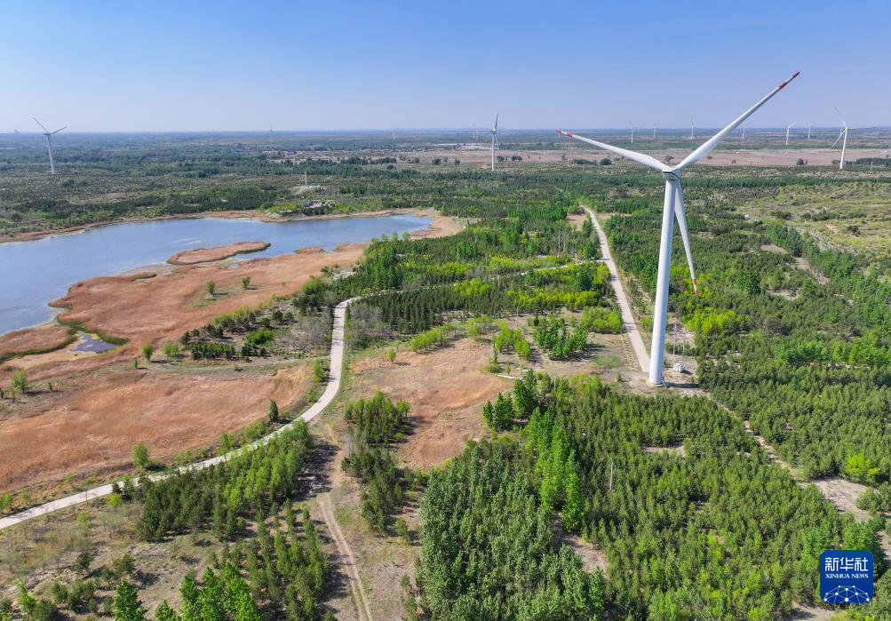 在通辽市科尔沁沙地“双百万亩”综合治理工程努古斯台项目区拍摄的风力发电机组(无人机照片,5月15日摄)。