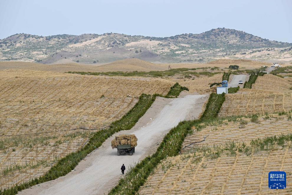 5月16日,在赤峰市翁牛特旗巴彦呼交嘎查其白线防沙治沙项目区,治沙工人在道路两侧拉滴灌带,以提高草方格中的植物成活率。